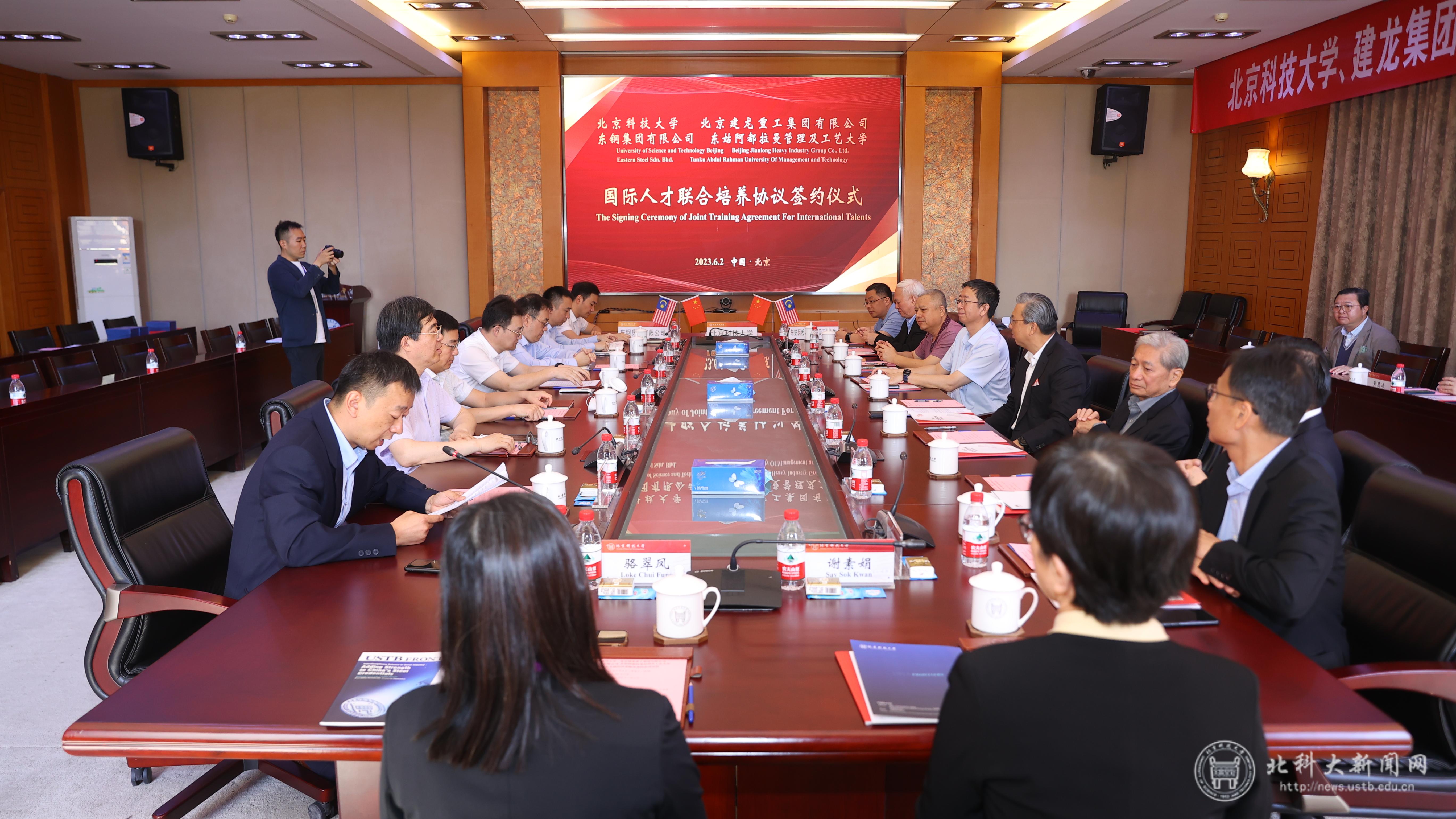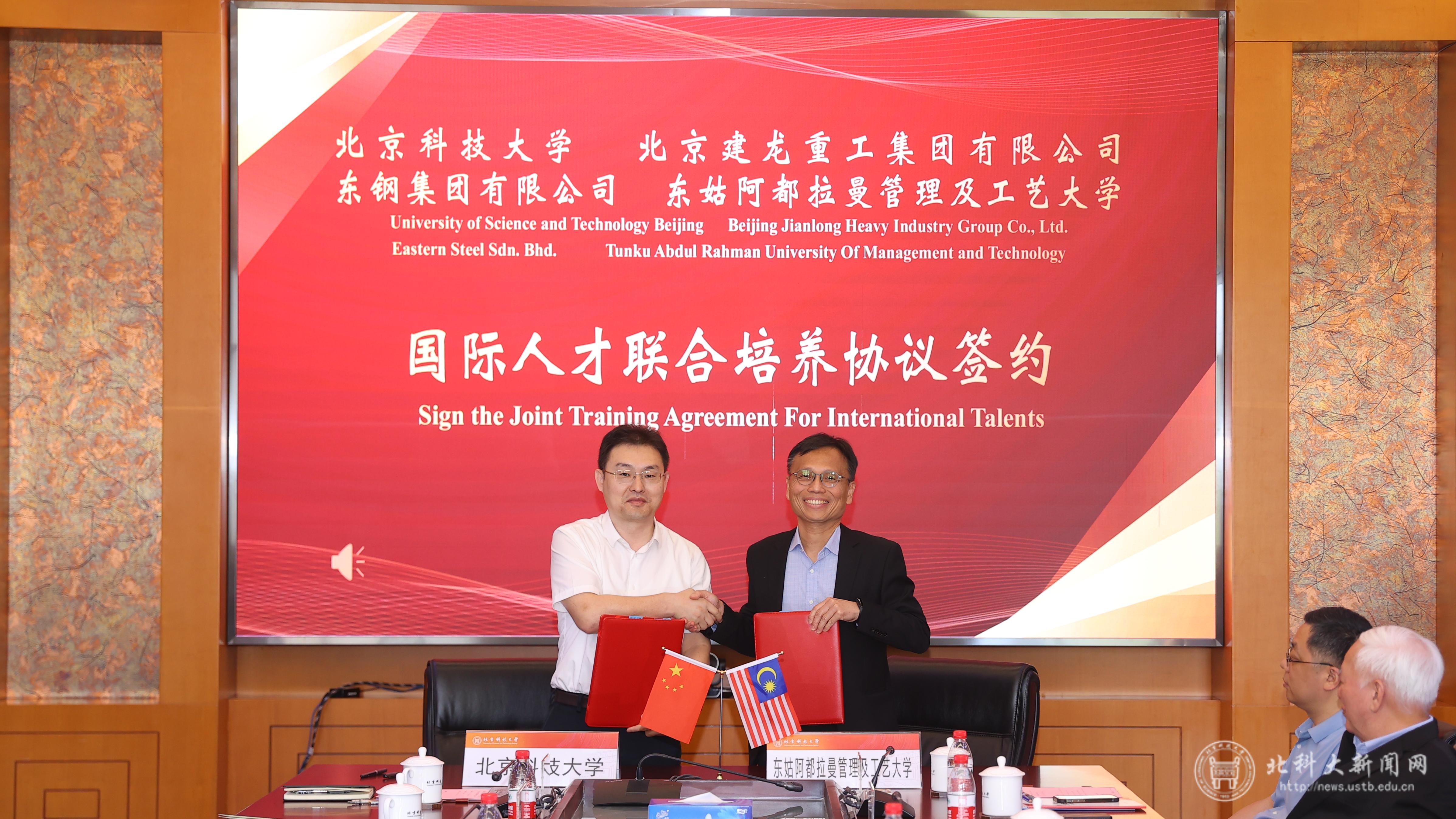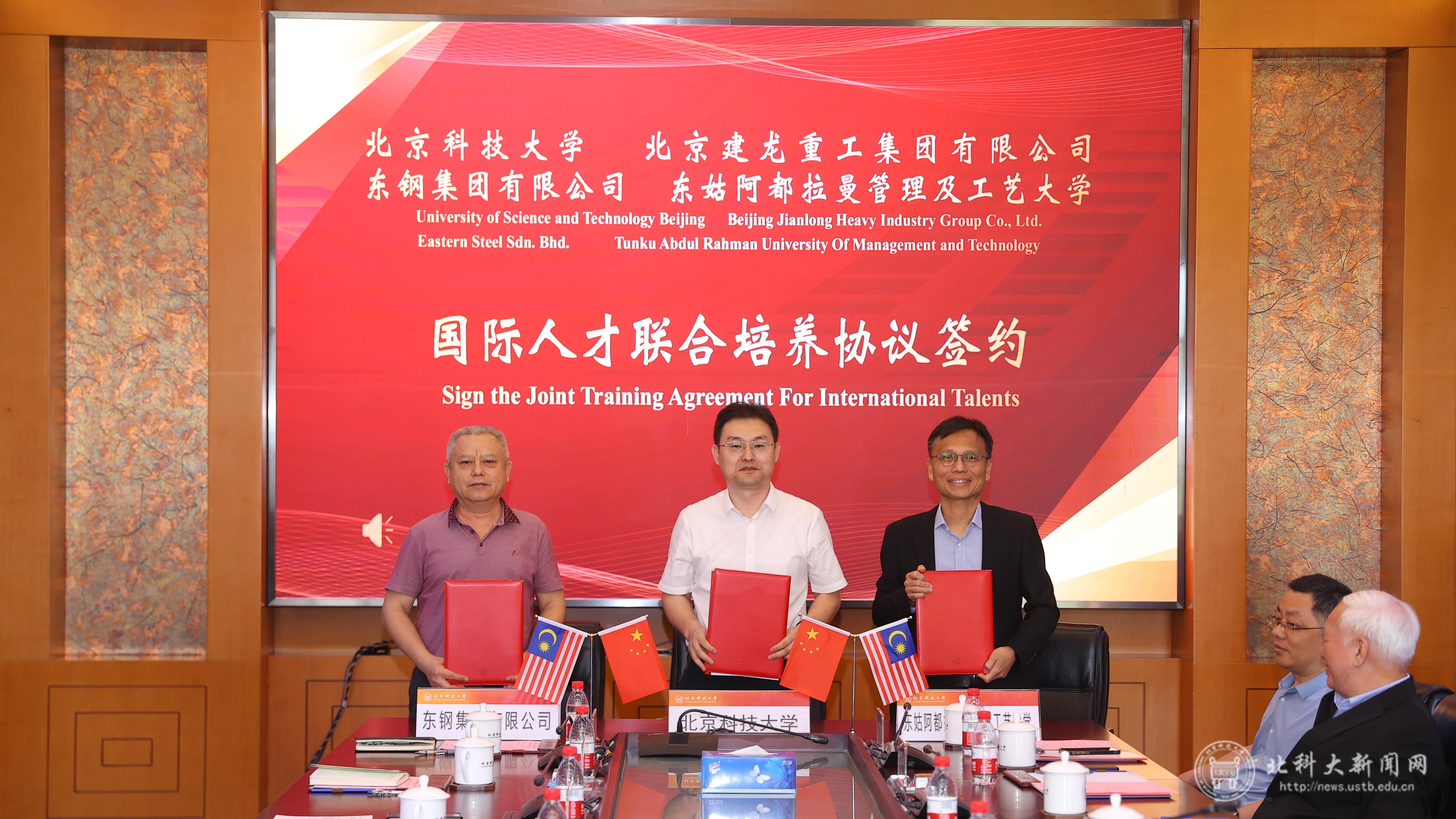 6月2日,学校举行与北京建龙重工集团有限公司、马来西亚东钢集团有限公司、东姑阿都拉曼管理及工艺大学国际人才联合培养协议签约仪式。建龙集团副总裁高全宏、东钢集团常务副总经理王升华、东姑阿都拉曼管理及工艺大学董事会主席丹斯里廖中莱和校长李仕伟、学校党委副书记于成文出席。签约仪式由国际学生中心副主任张虎主持。