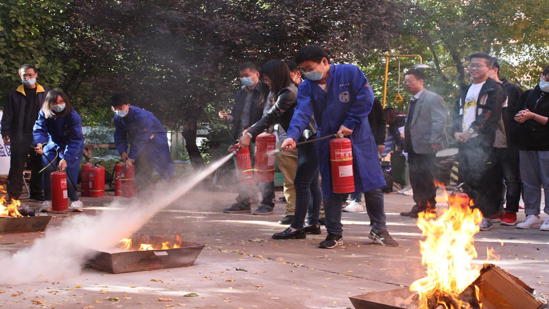 冶金楼大车间广场搭建了事故模拟区与消防体验区。事故模拟区内,4名师生对实验过程中有机危险废液遗撒灼伤、倾倒后导致起火的情境进行模拟。消防体验区内,师生们体验了用灭火器灭火,与以往不同,此次消防演习“用真火、真灭火”。