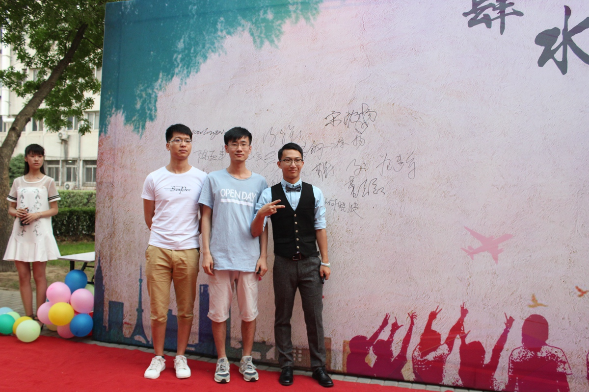 晚会开始前,2017届毕业生们依次走过红毯,在签名墙上签名并合影留念。