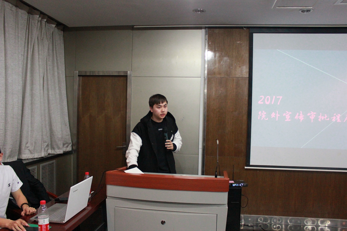 学生会办公室部长潘凌峰同学则是从公寓橱窗海报宣传审批要求出发,类推到篮球场宣传栏、食堂电子屏幕及校园网登录界面三个方面。他详细讲解了学院外宣传的基本章程制度以及注意事项,提出“未雨绸缪”四字箴言,告诫同学们校外宣传要提敲定,提前审批。简明扼要地对各种宣传方式的注意要点、操作程序及步骤进行了详细剖析。