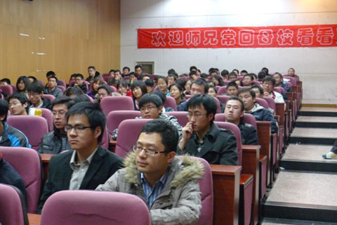 在张飞幽默恳切的话语中,学弟学妹们感受到了毕业学长的关心,看到了成功就业的希望,充满了面对工作的信心,同时也明白了就业心态在面对现实与理想之间差距时的重要性。