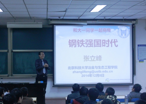 、组织架构和师资力量,并通过比较近十年来在《MMTB》、《ISIJ》、《Steel Research》等知名期刊上文章的发表数量向同学们展示了我校在钢铁研究领域取得的优异成绩。他告诉大家:“中国是绝对的钢铁强国,北科是绝对的钢铁强校,学在北科,应该学会充分利用好身边的宝贵资源,提高时间的利用效率。”