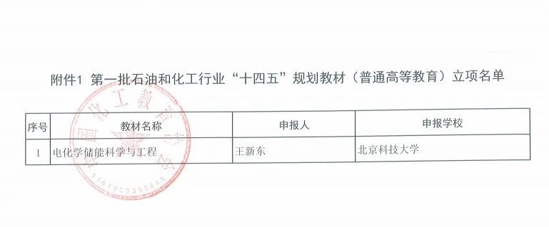 在中国化工教育学会公布的第一批石油和化工行业“十四五”规划教材(普通高等教育)立项名单中,由av电影 王新东教授主持申报的《电化学储能科学与工程》获批立项。