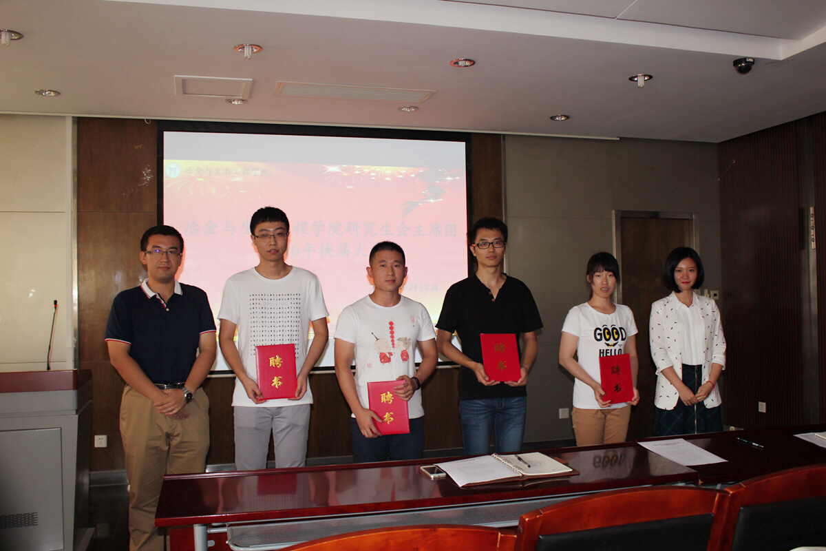 研究生会2016年主席团换届名单》。硕士2015级杨平、博士2015级陈威、博士2015级张剑、硕士2015级郝晓倩等四名新任主席团成员在掌声中走上前台,陈曦老师、李元坤老师为他们颁发聘书,表示祝贺。学院研究生会新任主席杨平同学代表新一届主席团发言。杨平同学表示,新一届主席团将秉承为同学们服务的宗旨,团结同学,共同努力建设具有品牌特色的冶金与生态学院研究生会。在未来的工作中加强联系,服务基层,共同营造多彩的冶研会大家庭,为同学们提供更加丰富的交流机会和广阔的展示平台。