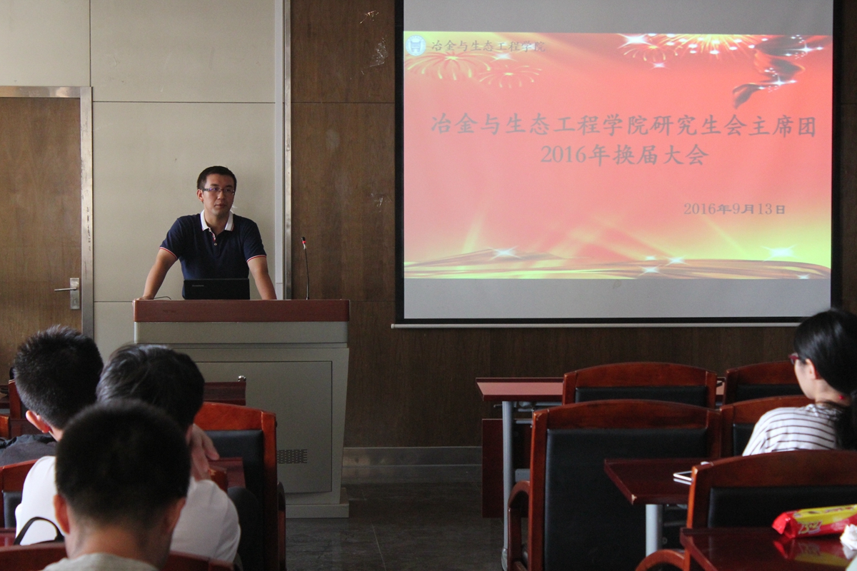 研究生会2016年换届大会在冶金生态楼青钢报告厅举行。学院研究生工作组组长、研究生辅导员陈曦老师,学院学生工作办公室主任、研究生辅导员李元坤老师出席,学院研究生会新任主席团成员、硕士2016级全体学生骨干参加。大会由新任副主席张剑同学主持。