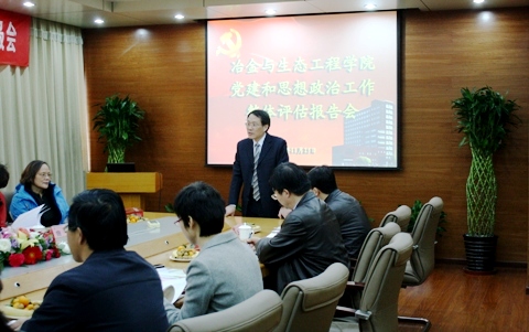 9点15分,评估汇报会正式开始,宋波书记代表学院作了“全面推进党建和思想政治工作――加强综合实力,引领学科发展,建设高水平研究型学院”的专题报告,全面地汇报了学院2008-2010年的党建和思想政治工作。宋波书记在报告中强调学院党委本着“围绕中心,服务大局”的思想,推进学院各项事业全面发展,保持学科领先地位、提高人才培养质量、提升科学研究水平、建设高水平学术队伍、全面推进德育工作、营造和谐育人氛围。学院党委探索完善民主决策监督机制,充分发挥教授会、教代会、党政联席会、院务会的作用,保证民主、科学决策,实施教授治学,教授治院。切实加强思想政治工作和党风廉政建设,发挥基层党支部战斗堡垒作用。报告最后展望了学院今后的努力方向,通过科学发展,最终成为世界冶金教育、科研中心。