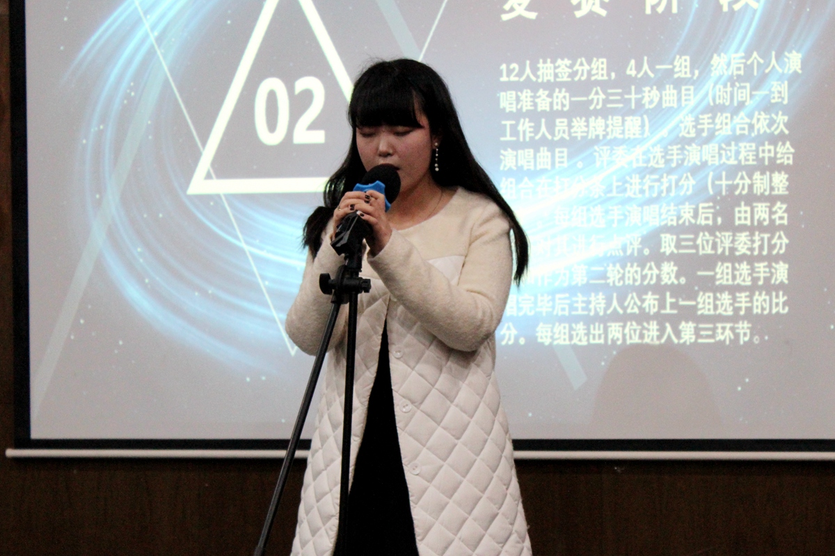 在最后的决赛阶段,六强选手摩拳擦掌,迎接即将到来的激烈角逐,现场的观众也为这压轴大戏屏气凝神,揣摩着最终的胜出者。演唱全首自选曲目的最终决赛,也为选手们增添了不少的难度,对整首歌的感情和节奏的把握,还有自己对紧张感的对抗,是一场技巧和精神的搏斗。在最后的决斗中,六强选手毫无保留,在最后的决胜局中展现了自己最好的状态,充分发挥了自身的优势。周雨童同学一曲《走在冷风中》,勾人心弦,将现场的听众带到了在爱别离,情难易,行走在冷风中的那个时候心酸、不舍、难过;随后胡晨钰的《阴天》则给现场带来了一阵清新的少女风,少了些沉重和伤感,多了点释然和不羁;而后徐佳豪带来的《我爱你》则是将现场的气氛带回到了温暖的晴天,跳动的音符下饱含真挚的情感歌声将刚刚“失恋”和“阴天”带来的坏心情一扫而空;李正韬的《落俗》表现得不落俗套,独特的声线将本身蕴含磁性的男低音魅力充分展现;紧接着,刘恒一首民谣――《少年锦时》,简单的调子,干净的声线,唱出了简单的生活里的懵懂初恋,还有对像乌托邦一样无忧无虑的日子的向往,深深俘获了评委的心;最后一位选手肖九三为大家带来了《末班车》,男低的低层,温婉的转音将歌词中蕴含的忧郁发挥得淋漓尽致,收获的阵阵掌声为本次对抗拉下帷幕。最终经过评委的最终决议,刘恒同学荣获冠军,李正韬同学收获亚军,肖九三同学获得季军,他们的深厚实力最终得到了评委们的认可。随后,院文艺部副主席戴承硕为他们递上了证明他们付出的荣誉证书。