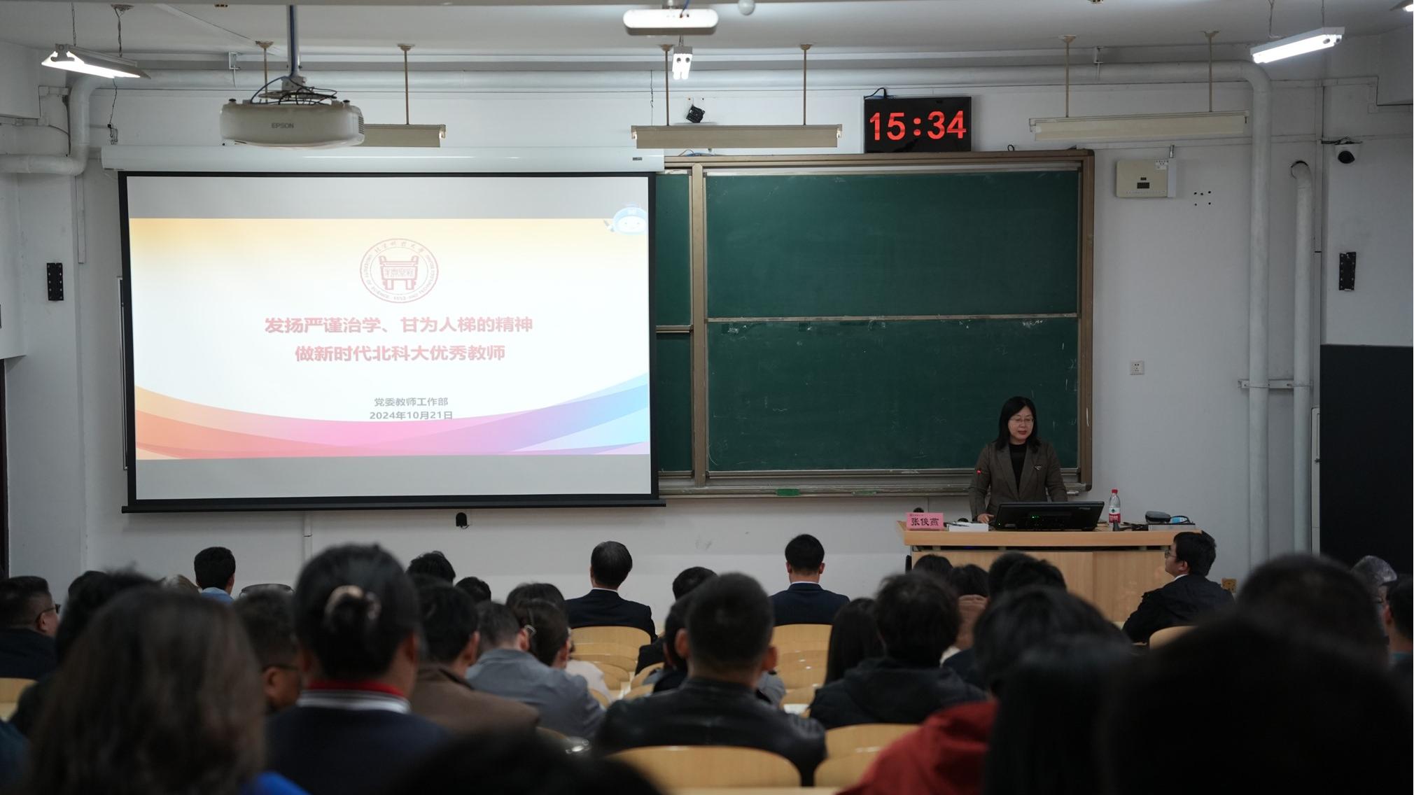 张俊燕在以“发扬严谨治学、甘为人梯精神,做新时代北科大优秀教师”为题,传达了党的十九大、二十大工作报告及习近平总书记在全国教育大会上的讲话精神,回顾了习近平总书记给学校老教授的重要回信精神,结合师德违规失范处理案例,深入解读了《新时代高校教师职业行为十项准则》和《研究生导师指导行为准则》。她强调,广大教职工要坚持不懈用新时代中国特色社会主义思想铸魂育人,明确准则,规范行为,落实立德树人根本任务,遵循教育规律和学生成长规律,因材施教,教学相长,发扬老一辈教育工作者“捧着一颗心来,不带半根草去”的精神,以赤诚之心、奉献之心、仁爱之心投身教育事业。