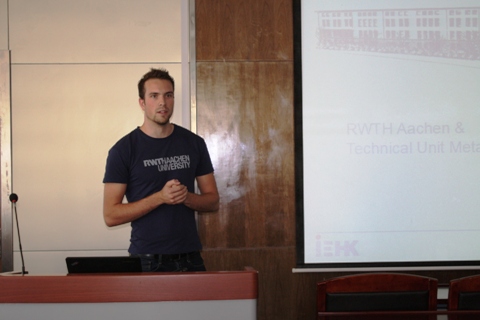 首先,亚琛工业大学学生代表Benedikt Flerus就亚琛工业大学的地理位置、悠久历史等概况作了大致的介绍,然后对该校的专业设置、课程教学安排、学位如何授予等同学们较为关心的问题作了较为细致的讲解介绍。Flerus还介绍了亚琛工业大学丰富多彩的课外生活,展示出的画面令在场的同学都心生向往。最后,Flerus同学代表亚琛工业大学诚挚地欢迎在座的同学来学习生活,也对能被邀请来参加交流活动表示了感谢。
