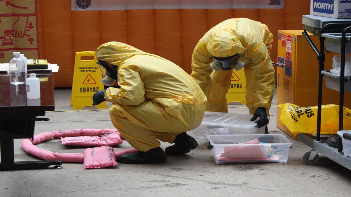 由资产管理处、保卫保密处和av电影 党委共同主办的实验室危险化学品泄露应急演习在10:00准时开始,四名师生模拟了甲苯意外遗洒,实验室责任教师对实验人员进行疏散,对受伤学生进行急救,报告学院,保卫保密处前来进行有机溶剂泄漏紧急处置的过程。