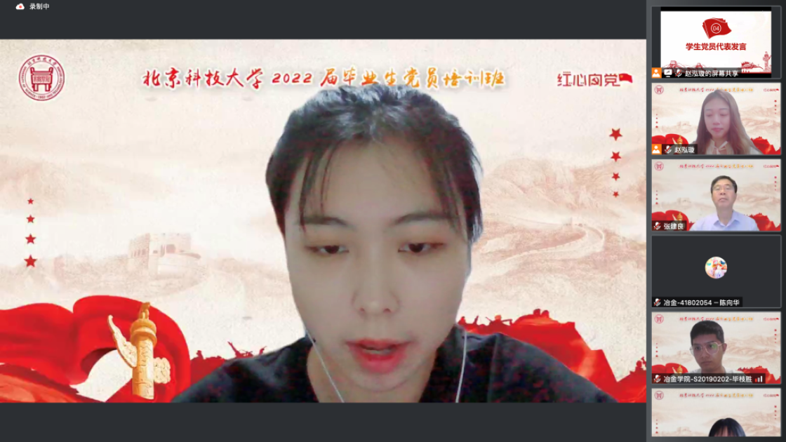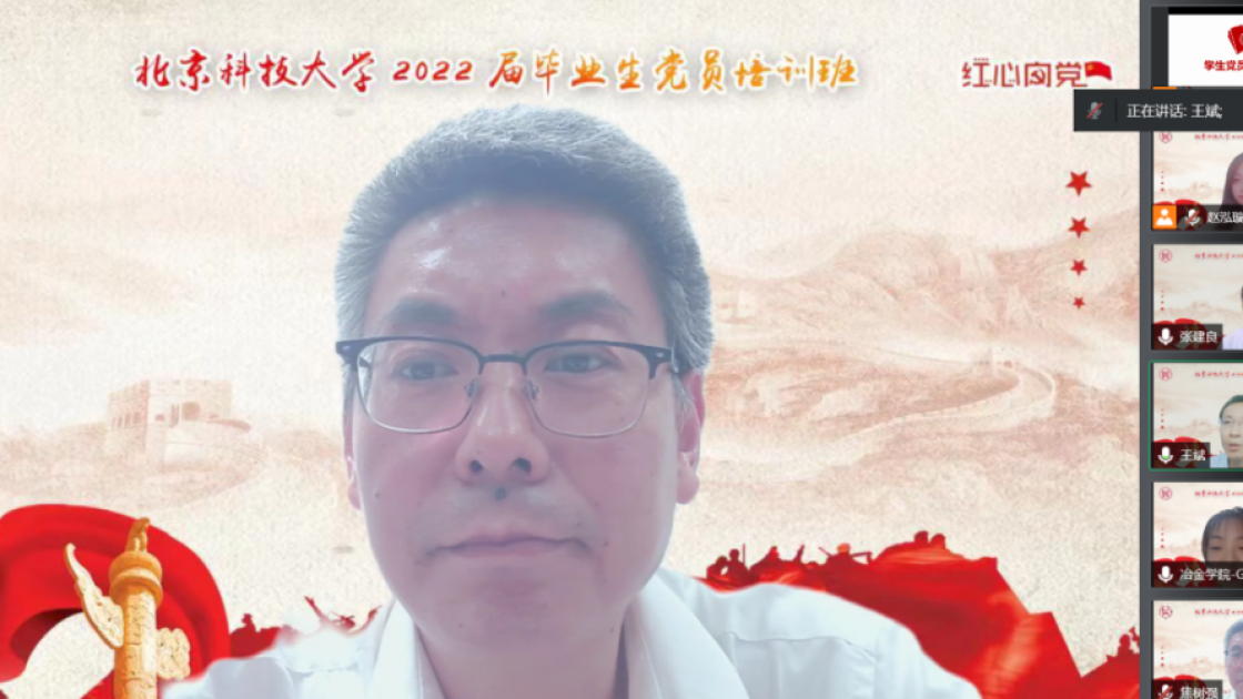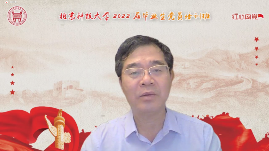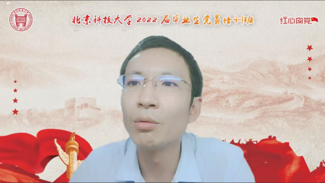 张建良以“不忘百年路,启航新征程”为主题进行党课讲授。他指出,疫情防控关键之时,年轻一代党员同志冲锋在前,让红色的党旗在疫情防控工作的志愿蓝中高高飘扬,充分彰显了新时代青年不遗余力在担当中作为,在磨砺中成长。他从习近平总书记给av电影 15位老教授们的回信精神出发,对毕业生党员提出三点希望,一是要坚定信念,志存高远,党员同志们要始终坚守初心,为民族复兴、国家富强无私奉献、无畏向前;二是要明德修身,勇担责任,毕业生党员们要以钢铁报国为己任,努力成为铸就科技强国、制造强国的钢铁脊梁;三是要奋勇争先,勤于实践,站在人生的新起点,冶金学子们带着北科赋予的印记,心怀憧憬,满怀感激,练就过硬本领,在祖国的大江南北建功立业,光荣的喊出“请党放心,强国有我”的铮铮誓言。